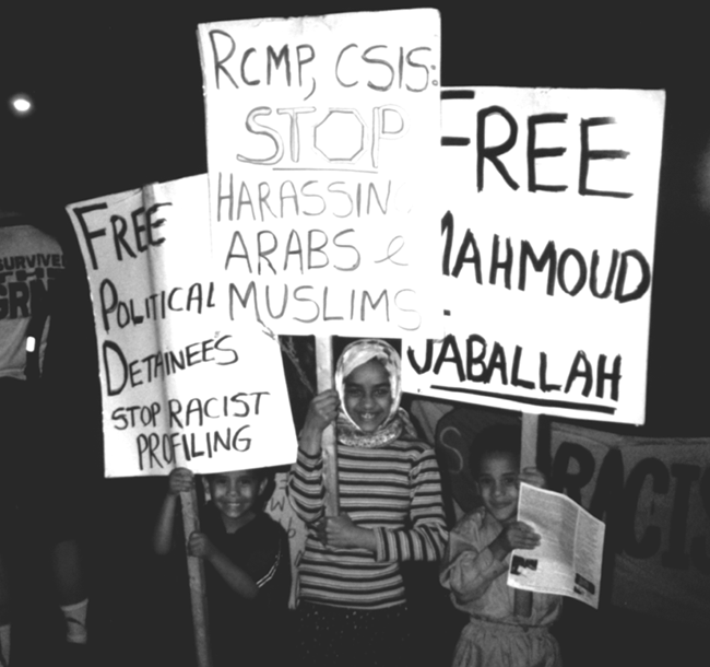 Back at the jail, the CBC interviews family members of Mahmoud Jaballah; his wife and five of their six children stand vigil with about 35 supporters, and explain how much they miss their father and want him home. The children talk about how much they cry when they miss playing with their father, who is a principal at a Toronto Islamic school. Many of those gathered in support stand in a kind of shocked silence: here is the human face of our increasingly repressive political system, one which scapegoats Muslims and anyone from the Arabic and Middle Eastern world with secret evidence that its victims and their lawyers are never allowed to see.